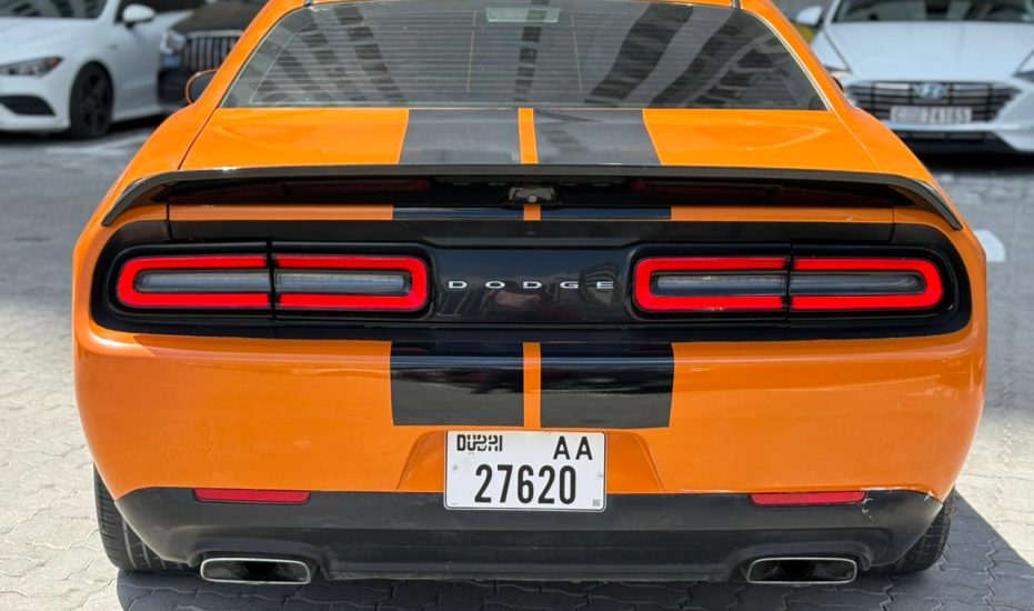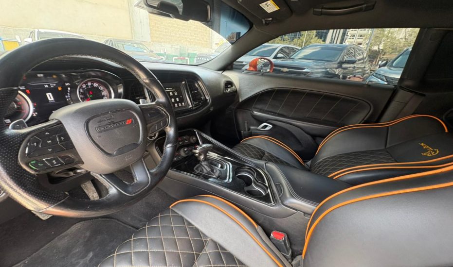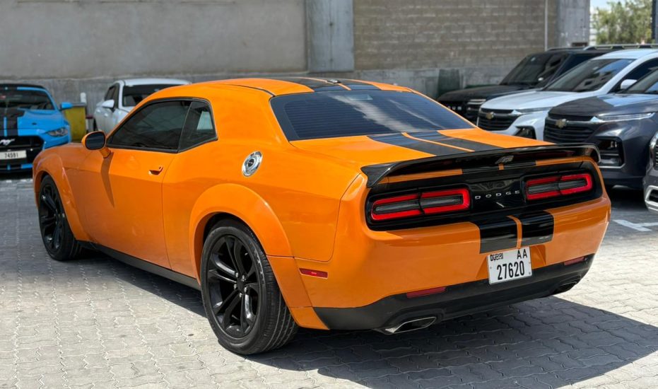 The 2021 Dodge Challenger R/T in Orange and Black is a powerful American muscle coupe, often featuring a 5.7L HEMI V8 engine, striking Go Mango or similar orange paint contrasted with matte black accents, and a performance-driven interior. Available with a Widebody kit, it offers an aggressive stance, premium leather seats, and modern technology like touchscreen infotainment.