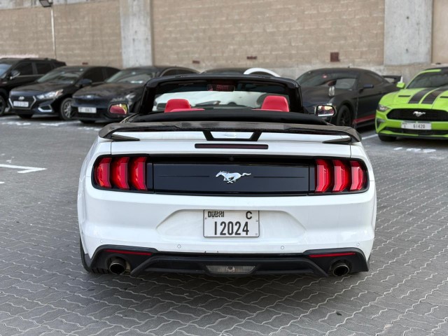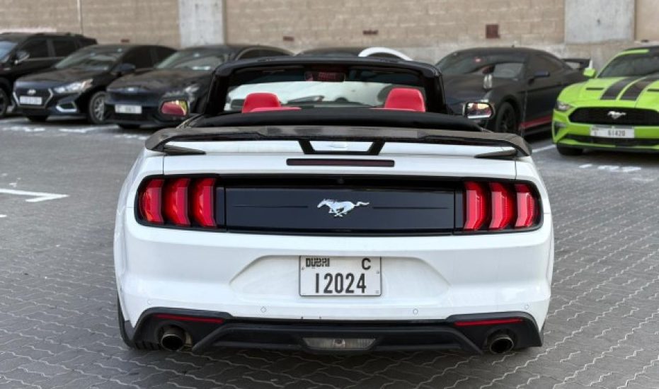 A 2023 White Ford Mustang EcoBoost is a sporty, turbocharged coupe or convertible featuring a 2.3L four-cylinder engine (around 310+ hp), available with a 10-speed auto or 6-speed manual, rear-wheel drive, modern tech like SYNC 3 with Apple CarPlay/Android Auto, customizable drive modes, and sport seats, often with premium interior options, offering strong performance in a sleek, iconic design with performance exhaust and distinctive wheels. The "Red" likely refers to accent colors, interior stitching, or maybe racing stripes, enhancing the white body's sporty appeal.